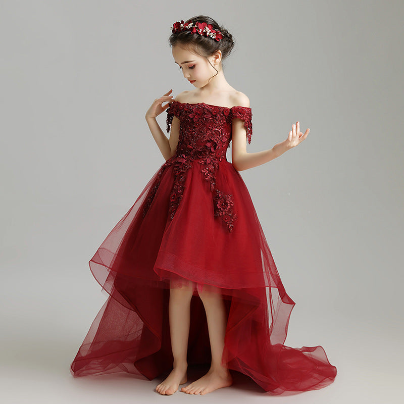 We didn't get this dress in burgundy, but we ordered two in white for my daughters to be flower girls. They are stunning - as high quality as a real wedding dress. My 9 and 7 year old daughter are OBSESSED. They are lace-up in the back so easy to make fit variations in size - the important thing is the length measurement so the front isn't too short. They do come with elastic straps (ours were white; not sure what other color dresses would be) which my girls felt more comfortable wearing in addition to the off-shoulder sleeves. Of course, they shipped folded so had some creases that needed to be steamed out, so give yourself plenty of time to get that done. Love these - VERY pleased for the price!